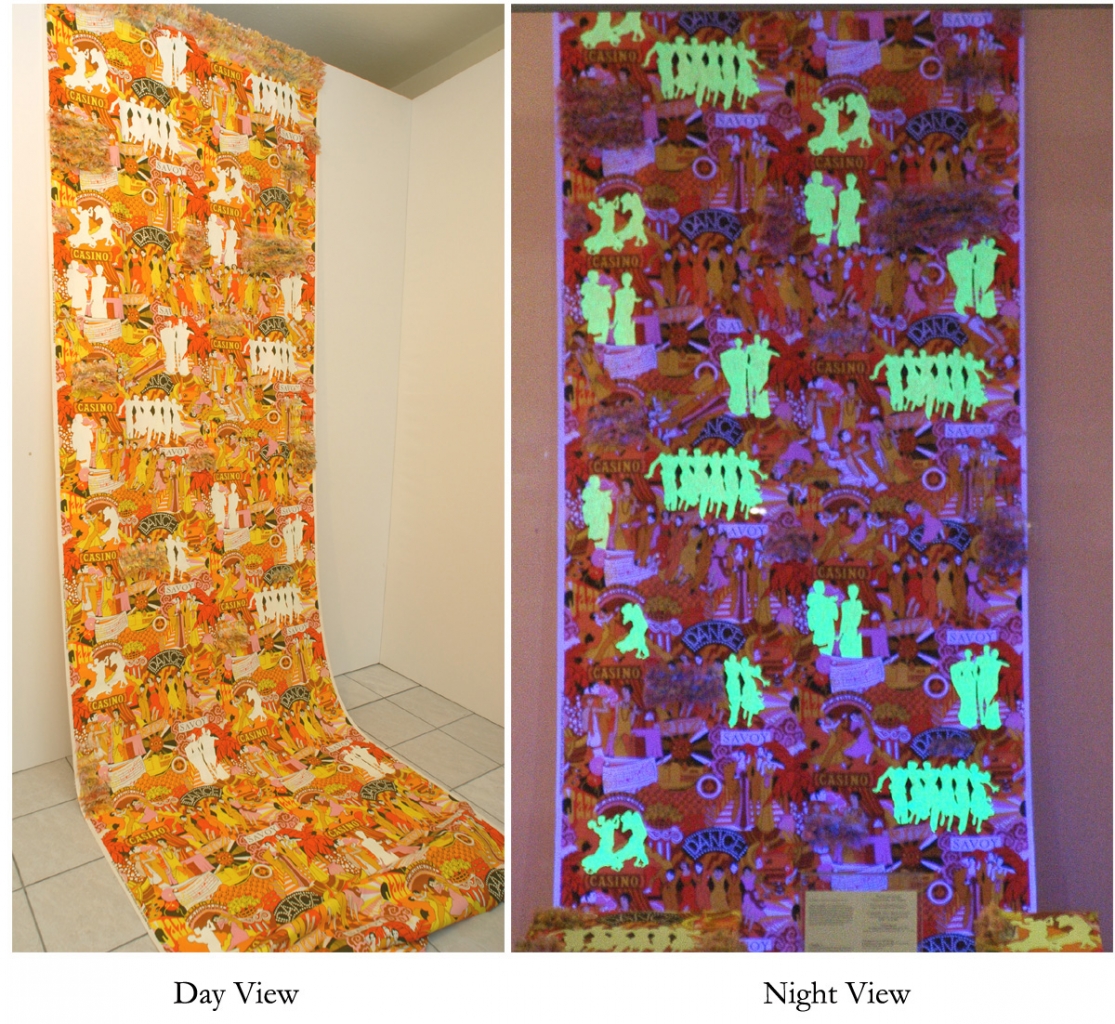fringed fabric & phosphorescent paint on printed cotton, black light